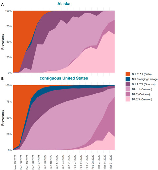 3.1. Higher Prevalence of Omicron Lineage BA.2.3 in Alaska vs. the Contiguous United States