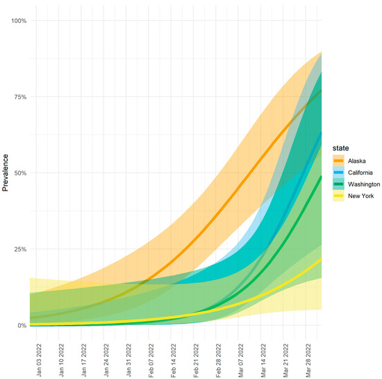 On 12 April 2022, we downloaded metadata, including lineage assignment using the same version of Pangolin (v4.0.6), and facilitated comparison with the Alaska dataset for all sequences available on GISAID and filtered for sequences from the United States of America (USA) collected between 28 November 2021 to 12 April 2022. We removed cases from Alaska, Hawaii, and US territories to focus our comparisons to the contiguous United States. Like Alaska, these isolated locations may have different dynamics. As before, to standardize for sequence quality and remove low coverage sequences, we removed sequences with more than 5% N. We also analyzed data at a state level for New York, California, and Washington. GISAID metadata was used to calculate the prevalence of variants, which was an approximation based on percent of sequenced cases each day.
