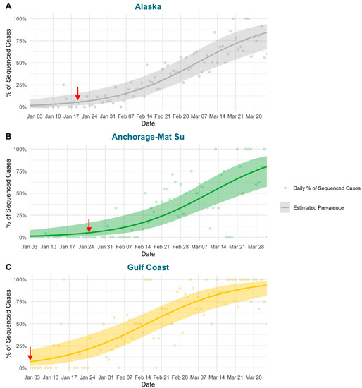 Logistic regression (line = regression; shaded region = standard error) estimating the prevalence of BA.2.3 over time in (A) Alaska and the two economic regions of Alaska with a deep enough coverage of cases including (B) the Anchorage-Mat Su and (C) Gulf Coast. Points represent the daily percent of cases assigned to BA.2.3 used to calculate the regression. The red arrow highlights when the regression estimated BA.2.3 was at greater than 5% prevalence.