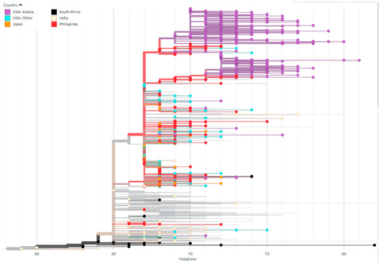 Phylogenetic tree of BA.2.3 cases with branch lengths represented by divergence of cases (number of mutations from Wuhan-Hu-1). Each point is a genome colored by country. Only countries that provide context for Alaska clades and clade origins are included in the visualization.