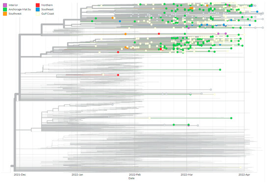 - Haan, T.J.; Smith, L.K.; DeRonde, S.; House, E.; Zidek, J.; Puhak, D.; Redlinger, M.; Parker, J.; Barnes, B.M.; Burkhead, J.L.; et al. Pattern of SARS-CoV-2 variant B.1.1.519 emergence in Alaska. Sci. Rep. 2022, 12, 20662. [Google Scholar] [CrossRef]