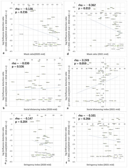 Association between infection control measures and influenza reduction in the mid-seasons. Association between influenza detection rate and (a) mask use in 2020, (b) social distancing index in 2020, (c) stringency index in 2020, (d) mask use in 2021, (e) social distancing index in 2021, and (f) stringency index in 2021. c in the y-axis is 0.0137. The p-value is Spearman’s simple correlation test with a one-tailed test. Rho is the correlation coefficient of non-parametric correlation analyses. Note the many data points of lowest value of y axis in all the panels correspond to no detection of influenza during the period according to the conversion equation.