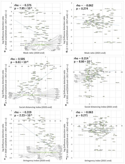 Association between infection control measures and influenza reduction in the end-seasons. Association between influenza detection rate and (a) mask use in 2020, (b) social distancing index in 2020, (c) stringency index in 2020, (d) mask use in 2021, (e) social distancing index in 2021, and (f) stringency index in 2021. c in the y-axis is 0.0137. The p-value is Spearman’s simple correlation test with a one-tailed test. Rho is the correlation coefficient of non-parametric correlation analyses. Note the many data points of the lowest value of the y-axis in all the panels correspond to no detection of influenza during the period according to the conversion equation.