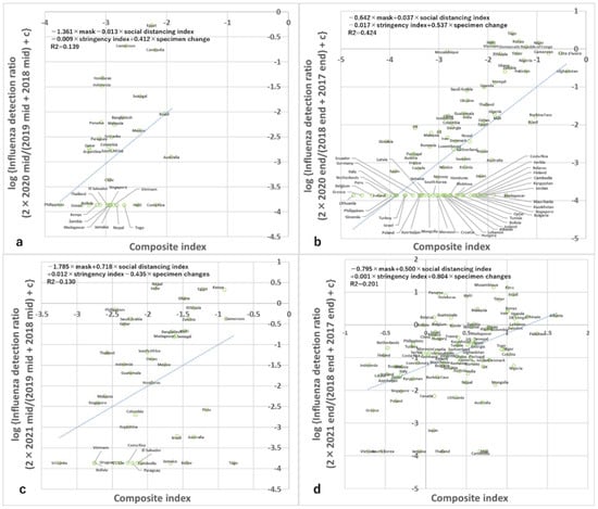 Then, the log-transformation of this ratio is used to mitigate the non-linearity of the associations between a dependent variable and independent variables in multiple regression analyses. As the dependent variable contains many zeros (countries where no influenza was detected during the relevant period of the pandemic at all), the log transformation adds one-half of the value of the lowest non-zero dependent variable among 4 seasons (0.000274) as has been done elsewhere []. This log transformation does not affect the statistics of the non-parametric correlation test and is only relevant to the results of the multiple regression analysis and the presentation of the results.