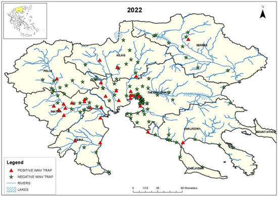 Map of Central Macedonia, with the sites where WNV-positive and -negative C. pipiens s.l. mosquitoes were trapped from May to September 2022. The location of the region in Greece can be seen in the inset in the upper left corner.