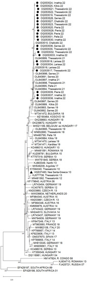 In 2022, Greece was the second most seriously affected European country, with 284 reported human cases of WNV, following Italy (586 cases) [27]. The aim of the present study was to screen for WNV Culex pipiens sensu lato mosquitoes, collected in 2022 in the Central Macedonia Region, and to perform phylogenetic analysis based on whole WNV-genome sequences.