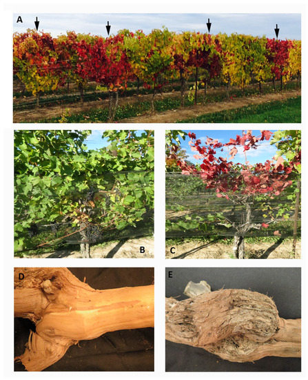Symptoms of Syrah decline observed in a commercial Syrah vineyard in Niagara, Ontario, Canada. (A) An infected vineyard block with Syrah decline. Arrows indicate the vines with a red canopy. (B) A vine without a red canopy. (C) A vine with a red canopy. (D) The graft union of a vine without a red canopy. (E) The graft union of a vine with a red canopy. Typical symptoms of Syrah decline include a red canopy (C), swelling and crevasses at the graft union (E).