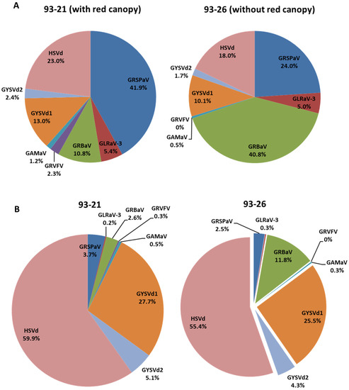 The distribution of viruses and viroids identified in 93-21 and 93-26 (both of Syrah clone 100) revealed by HTS. (A) The percentage of identified viruses and viroids was calculated as the number of sequence reads corresponding to each virus or viroid divided by the total virus and viroid reads in each sequencing library. (B) The percentage of identified viruses and viroids was calculated as the genome copy number of each virus or viroid over the total genome copy number of all viruses and viroids in each library. The genome copy number of each virus or viroid was calculated by multiplying the number of sequence reads specific to the virus by 51 (the number of nucleotides in each read), which was then divided by the size of the genome of the virus or viroid.