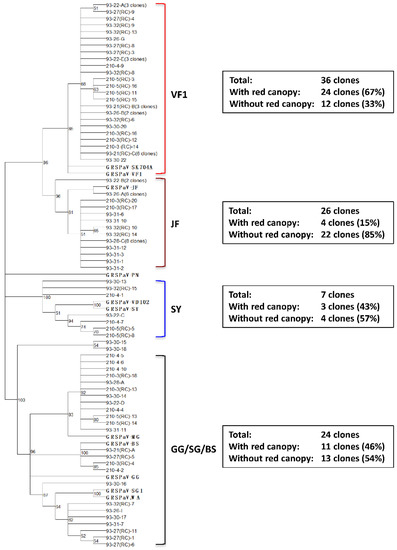 The population structure of GRSPaV variants in both types of vines was further examined by phylogenetic analysis of clones derived from RT-PCR using primers RSP35 & RSP36 (Table 1) [19] (Terlizzi et al., 2011) from five vines with red canopy and six without red canopy. A total of 95 clones (42 clones from vines exhibiting red canopy and 53 clones from vines without red canopy) were sequenced and resulting sequences were subjected to phylogenetic analysis. These resulting sequences were distributed among four phylogenetic clades: VF1, JF, GG/SG/BS, and SY (Figure 3). As shown in Figure 3, a large majority of the clones (62 out of the 95 clones) fall into two clusters, one represented by VF1 and the other by JF. Twenty four clones fall within the GG/SG/BS cluster, and seven clones fall within the SY cluster. Notably, 67% of clone sequences in clade VF1 (24 out of 36 clones) were from vines of red canopy whereas only 15% of clones (4 out of 26 clones) in clade JF were from vines with red canopy. The number of clones in clades GG/SG/BS and SY from declining vines is similar to that from non-declining vines (Figure 3).