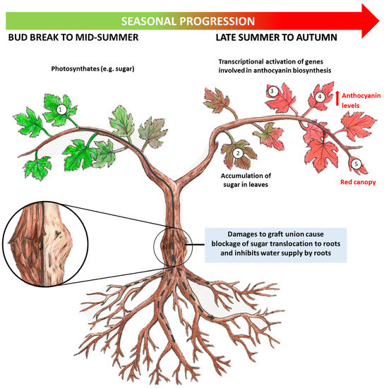 Here, we propose a theorem to account for the mechanisms underlying the development of Syrah decline (Figure 4). Syrah decline, as originally defined by French researchers [2], is an issue related to injury at the graft union between a scion and a rootstock that result in pits, grooves, cracks, and necrosis. Such an injury could be produced by pathogens including viruses. As a compensatory response, excessive cell division occurs at the graft union, leading to swollen union. Under conditions when grapevine experience sever water deficit due to low water content in the soil, and uncontrolled transpiration as is the case for Syrah grapes, transport of sugar out of leaves will also be impaired, resulting in the accumulation of glucose in leaves. In turn, this triggers the conversion of the colorless anthocyanidins to anthocyanins, manifesting in the form of red discoloration of the canopy. Supply of photo assimilates to shoot stems and roots would be impaired, limiting the development of roots and buds. Affected vines may die several years later as a result of the cumulative effects and worsening symptoms.