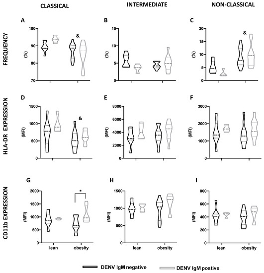 Monocyte subsets profile according to BMI and DENV IgM status. Classical (A,D,G), intermediate (B,E,H), and non-classical (C,F,I) monocytes distribution (A–C), HLA-DR (D–F) and CD11b expression (G–I) in lean individuals and individuals with obesity, according to DENV IgM status. Data are expressed as median (dashed line) and the first and third quartiles (dotted lines). & p < 0.05, lean versus obesity, irrespective of the DENV IgM status, two-way Anova. * p < 0.05, DENV IgM negative versus DENV IgM positive, two-way Anova, Šídák’s multiple comparison test.