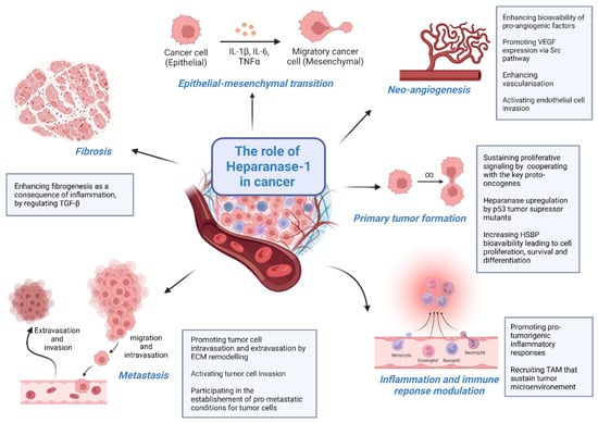 Major contributions of heparanase-1 in cancer. The enzymatic and non-enzymatic activities of heparanase-1 are involved in carcinogenesis, from the very early steps of tumor initiation to late stages including metastasis and invasion. Heparanase-1 plays a major role in several processes e.g., ECM remodeling, HS turnover, cell migration, tissue vascularization and remodeling, inflammation, and proliferation. As a global consequence, heparanase-1 contributes significantly to the establishment of the tumor microenvironment. Abbreviations: ECM (extracellular matrix), HSBP (heparan sulphate binding proteins), TAM (tumor-associated macrophages). [Created with BioRender.com].