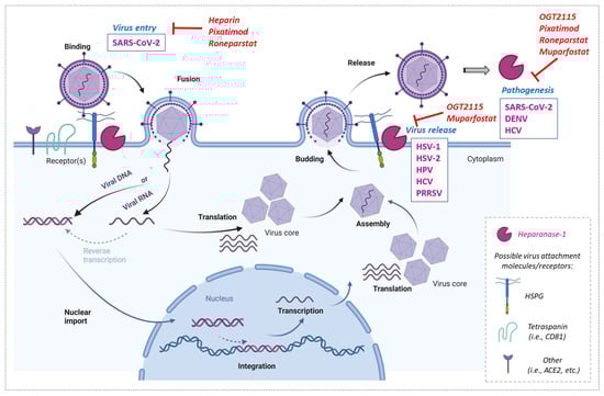 Impact of heparanase-1 on virus life cycles and their inhibition. Possible steps of the life cycle of RNA or DNA viruses for which heparanase-1 is thought to be involved are shown: binding and fusion. For an RNA virus without nuclear passage: translation and synthesis of viral proteins and genome, assembly of viral components, budding, and release of progeny virions. For an RNA virus with nuclear passage or a DNA virus: nuclear import (preceded by provirus formation in the case of retroviruses), integration (optional), transcription and synthesis of viral mRNAs, export and translation of viral mRNAs into viral proteins, assembly, budding, and release. Heparanase-1 is implicated in virus entry, release and/or pathogenesis when overexpressed. Inhibition of heparanase-1 with chemical compounds could block entry, release and/or pathogenesis of different viruses that require heparanase-1 during infection. [Created with BioRender.com].