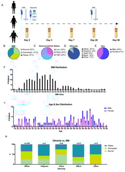 Overall design and metadata of the cohort. (A) Schematic representation of the time-course. Urine specimens were collected on each of 5 days for each subject. HAI was calculated using the Day 0 and Day 28 samples to determine the seroconversion status. (B–E) Proportional composition of the cohort for BMI, responder status (seroconversion), ethnicity, and sex. (F) Histogram of subject BMI across the vaccine cohort. (G) Histogram of subject age and sex across the vaccine cohort. (H) Proportional composition of BMI with respect to subject self-reported ethnicity. All subjects were recruited from the Athens, Georgia region.