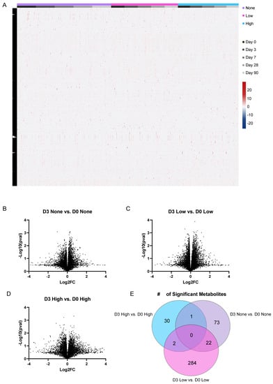 Summary of metabolomics data and subject response by seroconversion. (A) Overall semi-supervised hierarchical clustering for the metabolomics analysis; n = 895 samples analyzed with the relative quantification of 15,903 putatively identified metabolites. (B–D) Volcano plot representation of subject-specific metabolite fold change between Day 3 post-vaccination vs. Day 0 pre-vaccination. The x-axis represents the fold change and Log2, while the Y-axis represents statistical significance (t-test, two-tailed, equal-variance, uncorrected). (E) Venn diagram of overlapping significant metabolites between the three D3 vs. D0 comparisons of the High-, Low-, and None-responders, respectively.