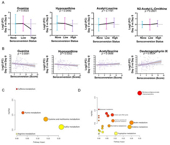 Metabolites associated with the response of the High-responders to vaccination. (A) Subject-specific changes in metabolites with respect to the seroconversion status on Day 3 vs. Day 0. Error bars represent the standard deviation. (B) Overall correlations of metabolite markers with the subject seroconversion score, n = 179, where the p-value represents the significance of the non-zero slope for linear regression. The red line represents the best-fit regression, and the grey area represents the 95% confidence interval for the line of regression. (C,D) Metabolic pathway analysis of the High-responders and None-responders, respectively. The x-axis represents the pathway impact (% of pathway covered), and the y-axis represents the statistical significance.