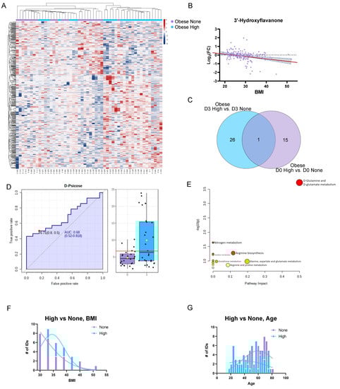 Next, we examined the impacts of obesity (BMI > 30) on the differential metabolic responses to influenza vaccination. Our cohort of obese subjects showed similar proportions of High-responders (44%) and None-responders (30%). We sought to identify candidate markers of this differential response in the D3 pairwise comparison for each subject relative to their pre-vaccine baseline. We used Student’s t-test (two-tailed, equal variance, uncorrected) to prioritize the candidate differential markers and found n = 523 metabolites which efficiently separated the obese High-responder subjects from the obese None-responder subjects in an unsupervised hierarchical clustering analysis, according to their urinary metabolic profiles (Figure 4A). We then examined whether these markers had an overall correlation with the subject BMI. We found that the putatively annotated metabolite 3′-Hydroxyflavanone (19% FDR) was the most correlated with the subject BMI (Figure 4B) and showed an inverse relationship. Other notable metabolites included Thioguanine (2% FDR), Homogentisic acid (1% FDR), and L-Carnitine (<1% FDR). Next, we investigated whether any of these markers of differential response among the obese subjects were predictive of the D3 metabolic response. Therefore, we compared the overlapping metabolites that were significantly different between the D3 obese High-responders and the obese None-responders, as well as the D0 obese High-responders and the obese None-responders (Figure 4C). Interestingly, only one metabolite was found to overlap, which was putatively identified as D-Psicose (8% FDR), a dietary aldohexose sugar. Therefore, we examined this metabolite for its potential as a predictive marker of vaccine response among the obese population using a receiver operator characteristic curve (Figure 4D). Using baseline pre-vaccination data (D0), the urine levels of the Psicose metabolite weakly predicted (AUC of 0.68) seroconversion among the obese subjects. We then examined the metabolites that were uniquely differential between obese High-responders and obese None-responders at baseline (D0, n = 15) using a pathway enrichment analysis. We found that changes in Glutamate (<1% FDR) and Pyroglutamic acid (<1% FDR) led to a significant enrichment (Holm p = 0.0156) in the Kegg pathway “D-Glutamine and D-Glutamate Metabolism” (Figure 4E). Interestingly, when examined through an ROC analysis, Glutamic acid and Pyroglutamic acid also showed weak biomarker potential, with each having an AUC of 0.70 (data not shown). We sought to determine whether a different underlying BMI distribution between the two groups could be a confounding factor in these results, but the evaluation of the histogram for each group showed overlapping and non-significant distributions for the BMI group mean (t-test, p = 0.6192) and variance (F test, 0.3220) (Figure 4F). We then examined whether a differential distribution of the subjects’ ages could be a confounding factor in the analysis of the obese High-responder and obese None-responder groups. Our cohort, indeed, showed a significant difference (p = 0.0110) in the number of aged subjects (the mean age was increased by 8 years) among the obese None-responders (Figure 4G), potentially indicating that age is a greater relative risk factor for poor vaccine responses than obesity alone.