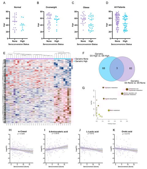 Based on the disproportionate role of age in predicting the obese responder status, we then examined the impact of age on the response to vaccination in the overall cohort. Unlike BMI, which was roughly evenly distributed with respect to the responder status, we found a significant age bias among the None-responders regardless of the BMI status (Figure 5A–D), but there was no correlation between the subject age and BMI in our overall cohort (p = 0.2988). We again used an uncorrected p-value (<0.01) on D3 to prioritize the candidate differential markers of the geriatric (≥65 yr age) High-responders (n = 9) and None-responders (n = 25) and found n = 624 differential metabolites (Figure 5E). The subjects’ profiles showed a stark clustering in this unsupervised analysis, with the largest magnitude fold changes among the up-regulated metabolites of the geriatric High-responder clade. Therefore, we again examined these candidate markers by comparing the shared metabolites between the High-responders and None-responders with respect to their Day 3 response to the vaccine vs. baseline (Figure 5F). A pathway enrichment analysis of the metabolites unique to the geriatric None-responders again showed “D-Glutamine and D-Glutamate Metabolism” due to Glutamate and Pyroglutamic acid changes, but this was not significant after Holm correction (p = 0.0025, Holm = 0.2108, Figure 5G). The pathway “Tryptophan Metabolism” was also enriched with four metabolites, namely 5-Hydroxyindoleacetate (15% FDR), L-Kynurenine (4% FDR), Formyl-N-acetyl-5-methoxykynurenamine (32% FDR), and 6-Hydroxymelatonin (50% FDR), but this result did not survive Holm adjustment (p = 0.0018, Holm = 0.1531). We then examined several metabolites associated with the None-responders in the geriatric group for correlations with seroconversion across the entire cohort (Figure 5H–K) with respect to the subject-specific changes between the pre-vaccination (D0) and D3 samples. We found statistically significant correlations (non-zero slope) between these markers, with most showing a negative correlation. One exception was 5-Aminovaleric acid, which showed a positive correlation with the seroconversion score and also showed one of the steeper slopes of the markers, which were manually interrogated. Each point increase in the seroconversion score was associated with a 3% increase in the associated level of 5-Aminovaleric acid.