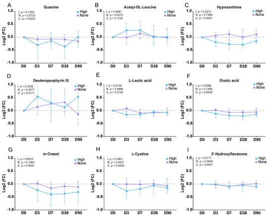 Finally, we assessed the metabolites of interest from all the earlier analyses for their potential as dynamic markers of the vaccine response over the 90-day time-course of observation post-vaccination (Figure 6A–I). As a negative control, we examined the obesity-correlated metabolite 3′-Hydroxyflavanone (Figure 4B, Figure 6I). This metabolite was not previously identified as statistically significant with respect to the responder status but was significantly correlated with the subject BMI. An assessment of its urinary levels across the entire cohort of High-responders and None-responders throughout the time-course showed nearly identical traces between the two groups following vaccination, and this was indicative of the vast majority of metabolites in the overall dataset. In contrast, the purines Guanine and Hypoxanthine showed highly significant differences with respect to the High- and None-responders over time (Two-way ANOVA—row factor: days post-vaccination, column factor: responder status). Hypoxanthine was lower in the High-responders at all the time-points post-vaccination than the None-responders (p < 0.0001), with the metabolite levels staying fairly flat among the None-responder group. The None-responders also showed flat levels of Guanine, whereas the High-responders appeared to show oscillating levels with a return to baseline by Day 90. Several other metabolites showed similar patterns, according to which the None-responders showed flat profiles, while the High-responders showed concave down-regulation, including Orotic acid, m-Cresol, and L-Cystine (Figure 6F–H). Lactic acid (Figure 6E) showed a unique profile in that the High- and None-responders changed in opposite directions on D3 post-vaccination but were otherwise in lockstep, though this observation did not reach significance in the two-way ANOVA. The High-responders also showed higher levels of Acetyl-Leucine in the first week post-vaccination, while the None-responders showed a muted and delayed response of the same profile (Figure 6B). Notably, none of these manually assessed metabolites of interest showed a statistically significant interaction between the ANOVA factors (days post-vaccination and the responder status), possibly indicating that the overall metabolic mechanism was the same in both groups, with varying magnitudes of change. We further assessed these markers for their specificity to either the geriatric group or non-geriatric (adult) group. Some metabolites showed stronger trends in either group, but interestingly, both Guanine and Hypoxanthine were statistically significant in both groups independently, potentially highlighting their role as broad markers of the response to influenza vaccination (Supplementary Figures S1 and S2).