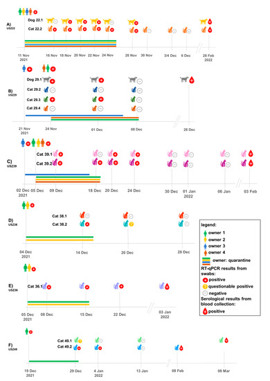 Overview of testing and results (RT-qPCR and serology samples) of animals and owners in households USZ22 (A); USZ29 (B); USZ39 (C); USZ38 (D); USZ36 (E); and USZ49 (F). Only owners that tested positive are shown. All households shown are located in the canton of Zurich.