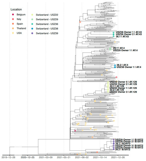 We reconstructed a phylogenetic tree including all the animal and owner viral sequences in the current study from an alignment of 348 sequences. From these 348 sequences, 7 were obtained from animal samples in the study, 12 were from the owner samples in the study, 41 were all high-coverage sequences assigned as Delta variants from dogs and cats submitted to GISAID from other countries, 241 sequences were randomly selected from all the sequences from the canton of Zurich, 46 sequences were randomly selected from any country, and 1 was the reference sequence Wuhan/Hu-1/2019. All sequences were collected from November 2021 to January 2022. Based on the maximum-likelihood tree, a time-scaled phylogeny was estimated with TreeTime [52] and a clock rate of 0.0008 substitutions/site/year [49].