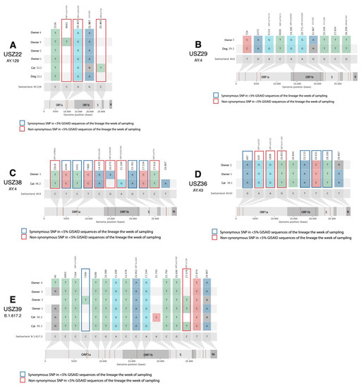 Snipit plot with nucleotide mutations for the five identified households with NGS data. Only mutated positions that are not common for the designated lineage (<75% GISAID sequences of the lineage) are shown. Mutations that are shared by less than 5% of the identified lineage (AY.129 for A, AY.4 for B,C, AY.43 for D, and B.1.617.2 for E) sequences in Switzerland in the week of sampling are indicated with a box: red for non-synonymous SNPs and blue for synonymous SNPs. (A) household USZ22, (B) household USZ29, (C) household USZ38, (D) household USZ36, and (E) household USZ39. Amino acid substitutions are indicated in gray on top of the non-synonymous mutations.