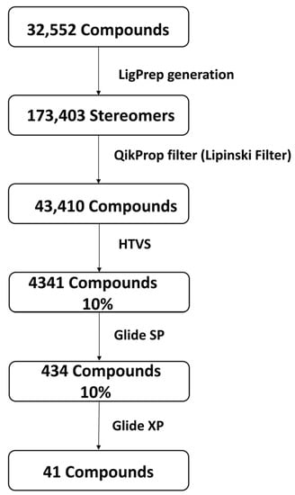 Figure 1 shows the preparation of the compounds and the virtual screening workflow. In this study, structure-based virtual screening was performed using Schrödinger Glide high-throughput virtual screening (HTVS) with Glide standard precision (SP) and Glide extra precision (XP) [37,38,39,40]. The SP mode reliably docks tens to thousands of ligands with high accuracy, and the XP (extra precision) mode provides further elimination of false positives through more extensive sampling and an advanced scoring function. Glides used a series of hierarchical filters to search for potential ligand sites in the active site area of receptors. In addition, on a grid, the shape and features of the receptor were signified by various sets of fields that offered increasingly precise scoring of the ligand pose [37].