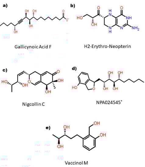 - Van Santen, J.A.; Poynton, E.F.; Iskakova, D.; McMann, E.; Alsup, T.A.; Clark, T.N.; Fergusson, C.H.; Fewer, D.P.; Hughes, A.H.; McCadden, C.A.; et al. The Natural Products Atlas 2.0: A Database of Microbially-Derived Natural Products. Nucleic Acids Res. 2022, 50, D1317–D1323. [Google Scholar] [CrossRef] [PubMed]
