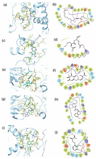 3D and 2D interaction profile of the MPXV cysteine protease with the top screened natural compounds (a,b) Gallicynoic Acid F, (c,d) H2 Erythro-Neopterin, (e,f) Nigcollin C, (g,h) NPA024545, and (i,j) Vaccinol M.