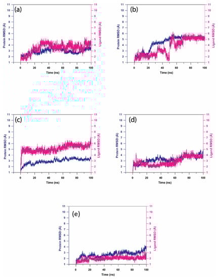 RMSD analysis on the docked viral proteins and ligands, i.e., natural compound trajectories (a) Gallicynoic Acid F, (b) H2 Erythro-Neopterin, (c) Nigcollin C, (d) NPA024545, and (e) Vaccinol M.
