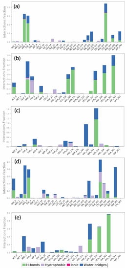 Protein–ligand interactions mapping for viral protein with selected natural compounds over the 100 ns simulation. (a) Gallicynoic Acid F, (b) H2 Erythro-Neopterin, (c) Nigcollin C, (d) NPA024545, and (e) Vaccinol M.