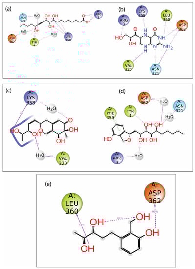 2D interaction diagram of protein–ligand contact for viral protein with selected natural compounds, i.e., (a) Gallicynoic Acid F, (b) H2 Erythro-Neopterin, (c) Nigcollin C, (d) NPA024545, and (e) Vaccinol M.