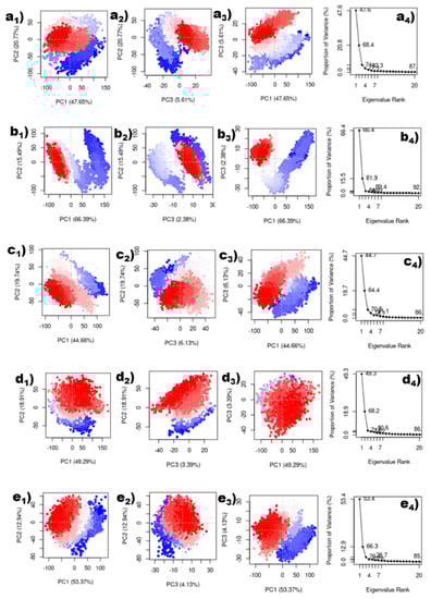 Principal component analysis of top five compounds. (a1–a4) Gallicynoic Acid F, (b1–b4) H2-Erythro-Neopterin, (c1–c4) Nigcollin C, (d1–d4) NPA024545, and (e1–e4) Vaccinol.