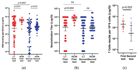 Comparison of immune responses of liver transplant recipients versus control immunocompetent subjects, after the third BNT162b2 vaccine dose was administered. Scatter plots showing the changes in anti-RBD IgG (a), neutralizing antibody (b) titers, and T-cell counts (c) at a median of 22 days (first test) and 133 days (second test) after administration of the third vaccine dose. The black horizontal line indicates the geometric mean values with a 95% confidence interval. Differences in paired samples were calculated using the Wilcoxon matched-pairs signed-rank test.