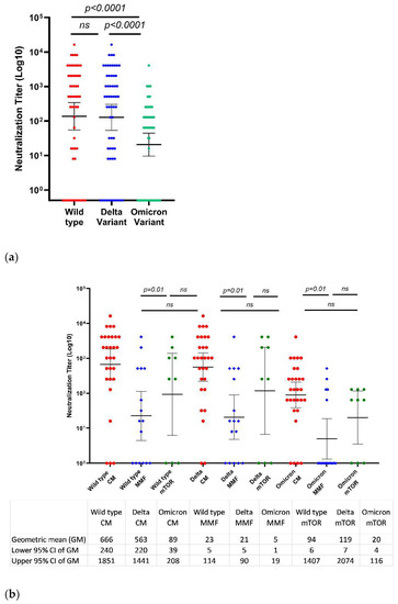 Several studies were conducted to evaluate the neutralizing ability of sera against the Omicron and Delta variants among immunocompetent patients vaccinated with two or three doses of different vaccines [7,16,22,23]. Nemet et al. reported improved neutralization efficiency (by a factor of 100) in 20 healthcare workers against the Omicron variant following the third dose compared to after the second dose; however, after three vaccine doses, neutralization against the Omicron variant was lower (by a factor of four) than that against the Delta variant [7].