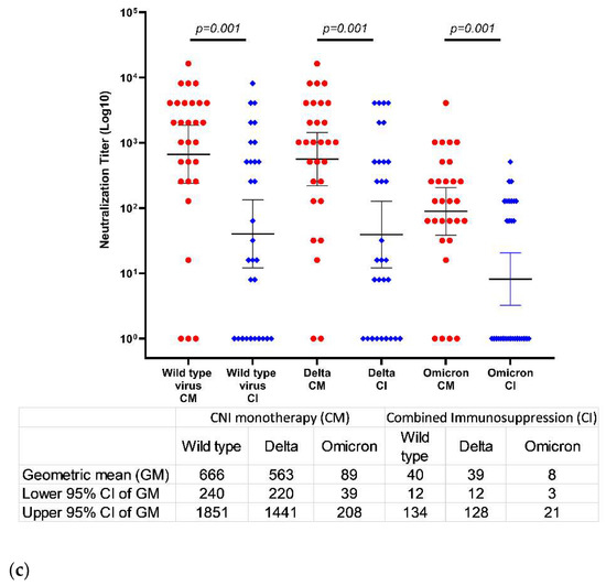 Evaluation of the impact of the different types of immunosuppression therapy on the neutralization efficacy of the different types of SARS-CoV-2 variants following the third vaccine dose revealed that the GMTs of the wild-type, Delta, and Omicron variants were significantly higher among the LT recipients receiving CNI monotherapy than among those receiving combined immunosuppression (666, 563, 89 and 40, 39, 8, respectively, (p = 0.01) (Figure 2)). The neutralization efficacy was significantly lower among patients receiving the combination of CNI and MMF as compared to those receiving CNI monotherapy (Figure 2) (p = 0.01). Although the titer of neutralizing antibodies against the variants was numerically lower among the LT recipients receiving CNI in combination with MMF compared to mTOR in combination with CNI, and it was lower among those receiving CNI in combination with mTOR compared to CNI monotherapy, these differences did not reach statistical significance (Figure 2).
