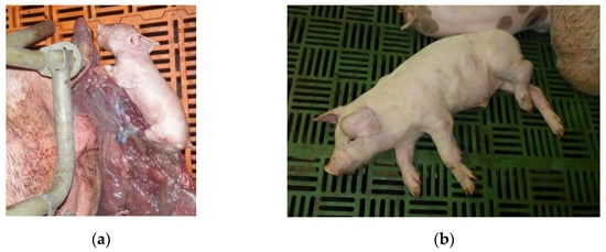 PRRS affected pigs on the farm of isolate GER18-258. (a) Stillborn piglet (b) Pig with swollen joints.