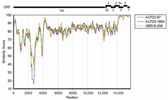 During clinical outbreaks or routine surveillance of pig herds in Germany and Austria, three PRRSV isolates were collected that exhibited a suspiciously high homology to the Ingelvac PRRSFLEX® EU upon ORF5 sequencing. The acronyms of the viral strains indicate the nation, year of isolation, and entry number in our files. To exclude the possibility of assessing a mixed virus population, PRRSV was isolated from the clinical samples on PAMs. In parallel, MARC-145 cells were inoculated with the clinical samples. GER18-258, AUT20-1664, and AUT22-97 could be isolated from PAMS showing a cytopathic effect and a positive immunofluorescence signal upon staining with a mAb anti-PRRSV N. None of the samples led to a productive infection of MARC-145 cells, indicating the absence of attenuated MLV vaccine or PRRSV-2 strains. Only a small number of PRRSV-1 strains replicate in monkey cells without prior adaptation. So far, we isolated only one virus showing this phenotype [26].