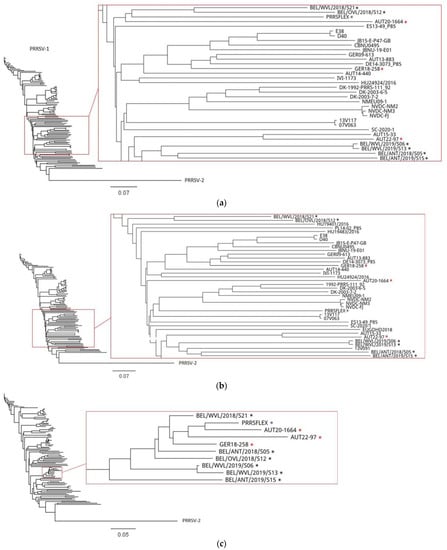 - Vandenbussche, F.; Mathijs, E.; Tignon, M.; Vandersmissen, T.; Cay, A.B. WGS- versus ORF5-Based Typing of PRRSV: A Belgian Case Study. Viruses 2021, 13, 2419. [Google Scholar] [CrossRef]