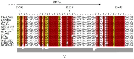 Predicted RNA folding of PRRSV sequence alignments. (a) Alignment and (b) predicted RNA folding of putative stem loop within ORF5 of several PRRSV-1 vaccines (Porcilis® PRRS, Amervac® PRRS, Ingelvac PRRSFLEX® EU) and wild-type strains. Figures were created with LocARNA version 1.9.1.