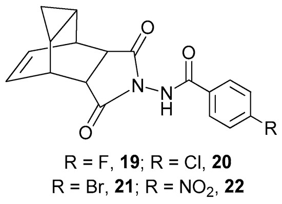 - Selivanov, B.A.; Tikhonov, A.; Belanov, E.F.; Bormotov, N.I.; Kabanov, A.S.; Mazurkov, O.Y.; Serova, O.A.; Shishkina, L.N.; Agafonov, A.P.; Sergeev, A.N. Synthesis and Antiviral Activity of 1-Aryl-3-{3,5-Dioxo-4- Azatetracyclo[5.3.2.02,6.08,10]-Dodec-11-En-4-Yl}ureas. Khimiko Farmatsevticheskii Zhurnal 2017, 51, 13–17. [Google Scholar] [CrossRef]