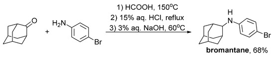 - Babushkin, A.S.; Navrotskii, M.B.; Novakov, I.A.; Orlinson, B.S.; Robinovich, M.D.; Sheikin, D.S.; Voloboev, S.N. Potential Synthetic Adaptogens. II. Synthesis and Pharmacological Activity of New Conformationally Labile Bromantane Analogs, N-[(Adamantan-1-YL)Methyl]-4-Bromoanilines. Pharm. Chem. J. 2017, 50, 781–787. [Google Scholar] [CrossRef]