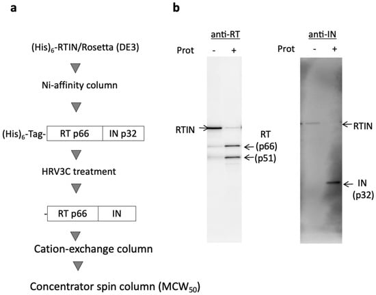 Purified rRTIN was treated with HIV-1 protease (PROSPEC, Rehovot, Israel) in PR-buffer [20 mM Tris-HCl (pH7.0) and 1 M NaCl] for 30 min at 37 °C. Proteolysis of rRTIN was verified by SDS-PAGE analysis and Western blot analyses using anti-HIV-1 RT or an IN antibody (Abcam, Cambridge, UK).