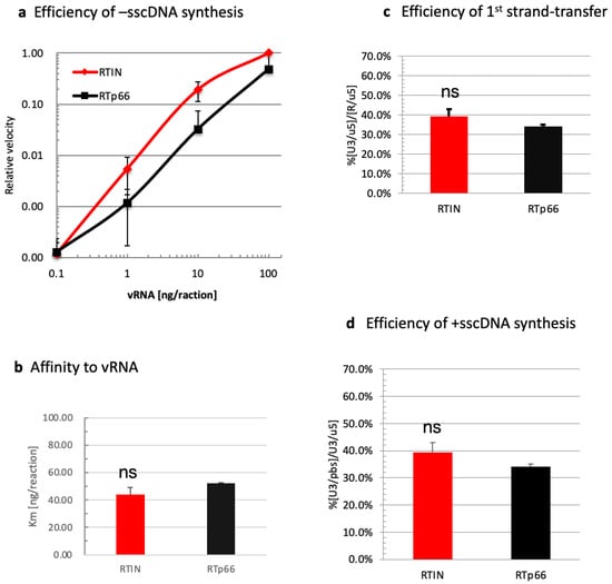 We directly compared RT activities of rRTIN and rRT in modified assay conditions in which the amounts of the reaction substrates were varied to address differences between these proteins in detail. As the critical role of IN during HIV-1 virion morphogenesis through interaction with vRNA has been reported [15,16,17], we first compared -sscDNA (R/u5) levels generated by rRTIN or rRT under different concentrations of synthetic vRNA [22] (Figure 3a). In this experiment, the velocity of -sscDNA synthesis during 60 min of the reaction was measured; data are shown as values relative to the velocity at 100 ng vRNA as 1.0. From the velocity plot results, we estimated the affinity of rRTIN or rRT for vRNA (Km for vRNA) by calculating the vRNA concentration to give a relative velocity of 0.5. The estimated Km value for vRNA was not significantly different between rRTIN and rRT (Figure 3b). We also found that rRTIN possessed the first strand-transfer (Figure 3c) and +sscDNA synthesis (Figure 3d) efficiencies equivalent to those of rRT. These results demonstrated that rRTIN possessed RDDP, RNase H and DDDP activities that were almost equivalent to those of RTp66 under these experimental conditions.