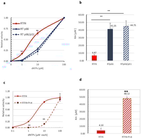 Impact of IN fusion on affinity of RT to dNTPs. (a) A reaction was performed in the presence of different doses of dNTPs (0.1, 1, 10, 100 μM) with a fixed vRNA dose (100 ng/reaction) and RTIN or RTs. The R/u5 copy number generated during 60 min incubation was measured, and the value at each dose was plotted as a velocity relative to the reaction with 100 μM of dNTPs as 1.0. The value at each dNTP dose is shown as means ± SD (n = 3). (b) The Km for dNTPs was estimated by calculating velocity at 100 μM dNTPs as the maximum velocity in the assay condition. The Km value of each protein is indicated on the top of each bar. Student’s t analysis showed significant differences between RTIN and either RTp66 or RTp66/p51 (** p > 0.01, n = 4). (c) Effect of protease cleavage of RTIN. rRTIN with or without digestion with HIV-1 protease was subjected to reaction, and data are plotted as described for a. (d) The Km for dNTPs was estimated by calculating velocity at 100 μM dNTPs as the maximum of velocity in the assay condition. The Km value of each protein is indicated on the top of each bar. Student’s t analysis showed significant differences between rRTIN with and without protease treatment (** p > 0.01, n = 4).