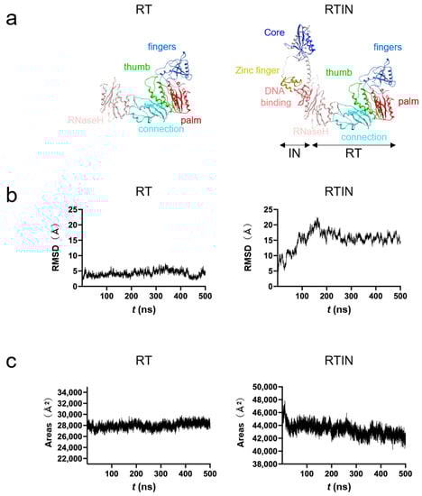MD simulations of RT and RTIN proteins of the HIV-1NL4-3 clone. The amino acid sequence of the RTIN portion of the Pol region of the HIV-1NL4-3 molecular clone [24] was used to construct an RTIN model by the AlphaFold2 program [23]. The obtained RTIN model gave a per-residue confidence score (pLDDT) of 83.3, in the “Confident” range [23]. An RT model was constructed with the RT domain of the RTIN model by deleting the IN domain using MOE (Chemical Computing Group, Montreal, Quebec, Canada). The RT and RTIN models were subjected to MD simulations using modules in Amber 16 [32] as described previously [28,29,31]. (a) Initial models of RT and RTIN fusion protein before MD simulations. (b) Structural dynamics of RT and RTIN fusion protein during MD simulations. RMSDs between the structure of the initial model and those at given time points of MD simulation were used to monitor the overall structural changes during simulations. (c) Analysis of areas of exposed surfaces of RT and RTIN in solution during MD simulations.