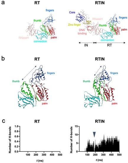 To gain structural insights into the impacts of IN fusion on the biochemical activities of RT, we conducted MD simulations of RT and RTIN proteins. Molecular models of RTIN fusion protein and RT protein of the HIV-1NL4-3 clone were constructed as described in Materials and Methods (Figure 6a) and subjected to MD simulations using Amber 16 [32]. The MD simulation is a computational method to delineate dynamic behaviors of biological macromolecules under thermal motions of atoms and molecular collisions in solution. This technique thus has been applied to characterize in silico the physical properties of biomolecules near the physiological conditions [38].