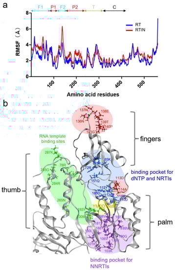 Structural fluctuations of biological molecules in solution play crucial roles in molecular interactions [39,40,41] and thus in the biological phenotypes of viruses [28]. To gain insights into the possible impacts of IN fusion on fluctuations in the interaction surfaces of RT, we compared structural fluctuations of individual amino acid residues in the RT domain between RT and RTIN models by using RMSF as a quantitative indicator. The RMSF has been used to clarify cis-allosteric effects of genetic mutations [28,42,43,44] and effects of molecular interactions [30,31] on the physical properties of the interaction surfaces on the viral biomolecules. Basically, the magnitudes of the fluctuations were augmented in most of the amino acid residues in RTIN as compared with those in RT (Figure 8a, red line). Importantly, sites heavily influenced by IN fusion, with RMSF increases above 1.4 Å, contained 113D and 114A residues for dNTP binding [45] and NRTI binding [46] on the palm subdomain, and contained the β7/β8 loop on the fingers subdomain (136N, 137N, 138E, 139T, 140P and 141G) (Figure 8a). Fluctuations in NNRTI binding pockets on the palm subdomain [46,47] were also augmented with an RMSF increase of 0.8-1.0 Å (Figure 8a). On the other hand, changes in the RMSF of RNA template binding regions, composed of the fingers, thumb, and palm subdomains, were mild and increased between 0.1–0.4 Å (Figure 8b). Figure 8b summarizes the three-dimensional locations of the influenced sites with an RMSF increase above 1.4 Å (red circle) along with those of amino acid residues involved in binding to natural substrate and inhibitors. These results suggest that IN-fusion into RT can influence the structural dynamics of the polymerization active center and inhibitor binding sites of RT in cis.