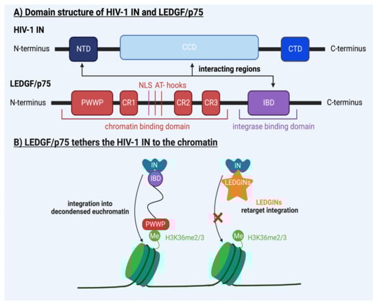 (A) Domain structure of HIV-1 integrase (IN) and lens epithelium–derived growth factor (LEDGF/p75). HIV-1 IN consists of an N–terminal domain (NTD), a catalytic core domain (CCD) and a C–terminal domain (CTD) [3]. LEDGF/p75 consists of an integrase–binding domain (IBD), binding the viral IN, and a PWWP domain, binding epigenetic marks in the genome associated with active transcription such as H3K36me2/3 [38,39,40,41,42]. (B) LEDGF/p75 tethers HIV-1 IN to chromatin. LEDGF/p75 simultaneously binds HIV-1 IN with its integrase–binding domain (IBD) and chromatin through its PWWP domain, tethering HIV-1 IN to decondensed chromatin regions, tagged by H3K36me2/3 [38,39,40,41,42]. HIV-1 integration can be targeted away from H3K36me2/3 with the use of LEDGINs, small molecules that inhibit the interaction between HIV-1 IN and LEDGF/p75 [22,23]. (Figure created with Biorender.com on 17 December 2022).