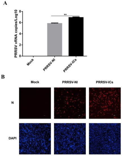 The PAMs were prepared in a 24-well plate at a ratio of 5 × 105 cells/well. After attachment for 12 h, PRRSV (2000 TCID50/mL)/anti-PRRSV IgG (400 μg/mL) immune complexes (PRRSV-ICs) and PRRSV (2000 TCID50/mL)/porcine negative IgG (400 μg/mL) admixtures (PRRSV-NI) were prepared as previously described [6]. Then, the adherent PAMs in the plate were, respectively, inoculated with PRRSV-ICs and PRRSV-NI, and normal cells were used as a mock trial. After 2 h, the medium was changed to the fresh RPMI-1640 medium containing 10% FBS. The cells and culture supernatants of all groups were, respectively, collected to detect the proliferation of PRRSV at 24 h post-infection (hpi) by an immunofluorescence assay (IFA) or quantitative reverse transcription PCR (RT-qPCR).